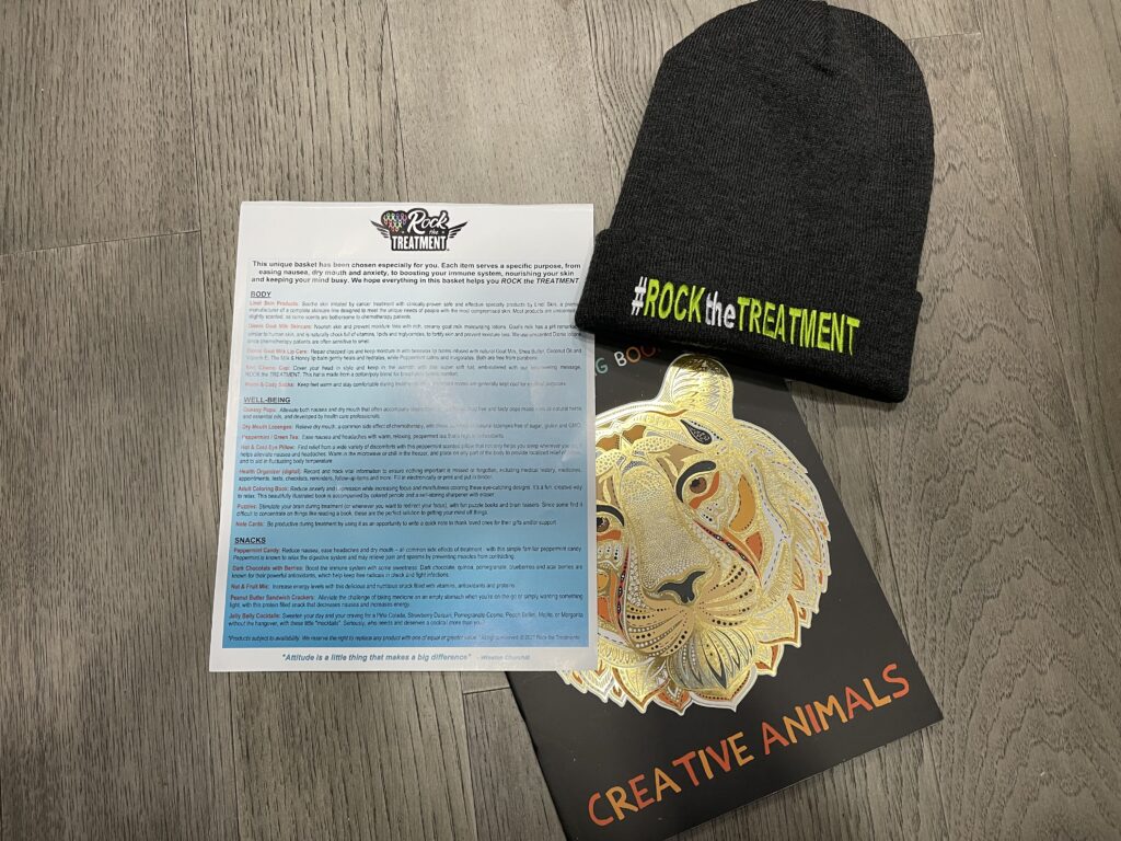 For now, here it goes. It has lots of goodies for a patient that must endure the time to put in for radiation and chemo. From the cool hat you have seen to socks, to an eye mask, to puzzles, color books, coloring pencils, snack out the ying yang and all wrapped up in a box. There is so much more, even has lotions, lip balm, tea, candy and look closer to what I may have missed.