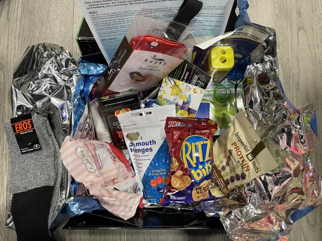 For now, here it goes. It has lots of goodies for a patient that must endure the time to put in for radiation and chemo. From the cool hat you have seen to socks, to an eye mask, to puzzles, color books, coloring pencils, snack out the ying yang and all wrapped up in a box. There is so much more, even has lotions, lip balm, tea, candy and look closer to what I may have missed.